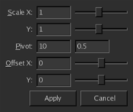 • Scale (press Alt+S) - scales in either the x direction (changing timing) or y direction (changing the parameter value). Negative values reflect the curve about the values entered in the Pivot fields.