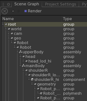 Assemblies and components help you define convenient points of expansion for the scene graph. They are usually defined as part of the asset creation process, but you can also define them within Katana. An asset’s hierarchy usually consists of an assembly and then below the assembly are other assemblies or components, and below the components is the full geometry data.