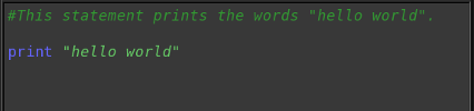 When entering the statement, you may notice that any words that are Python's keywords, such as print and import, turn purple, while strings and comments (content in quotation marks or following a #) become green.
