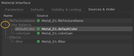 Promoted parameters can be rearranged in whatever order you like. For example, you might want to position more commonly used parameters at the top of the Parameters tab or organize parameters alphabetically. Promoted parameters are listed in the order they appear on the Sources & Order tab.