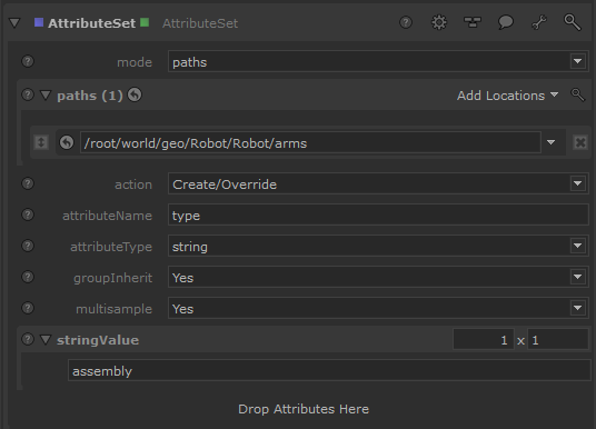 A simple example of using an AttributeSet node to change the location type, which is simply the type attribute for a location, to assembly.