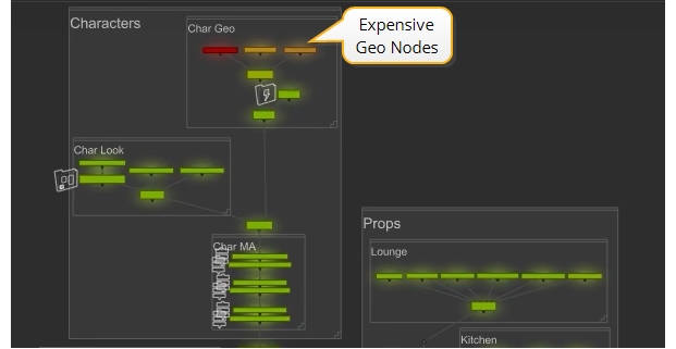 In this example, the Char Geo import nodes are clearly the most expensive nodes.