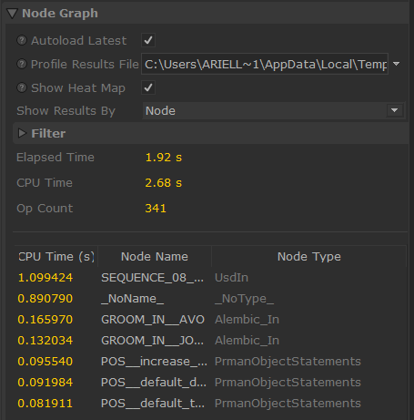 One example of why you might want to do this, is when specific nodes may naturally have a high cook time result. For example, nodes which are referencing geometry (e.g. the UsdIn) may display the highest CPU Time in the list, but it’s sometimes not an area that will require any optimization. Narrowing down the search to focus on areas that will need that attention is therefore more useful when optimizing Katana projects.