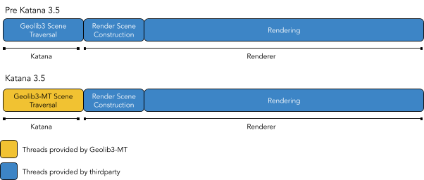 Determines how many logical cores Geolib3-MT uses during scene traversal phase. Unlike previous versions, Geolib3-MT uses an internal thread pool to improve scene traversal time. The following diagram demonstrates the difference between Geolib3-MT and previous versions of Katana.