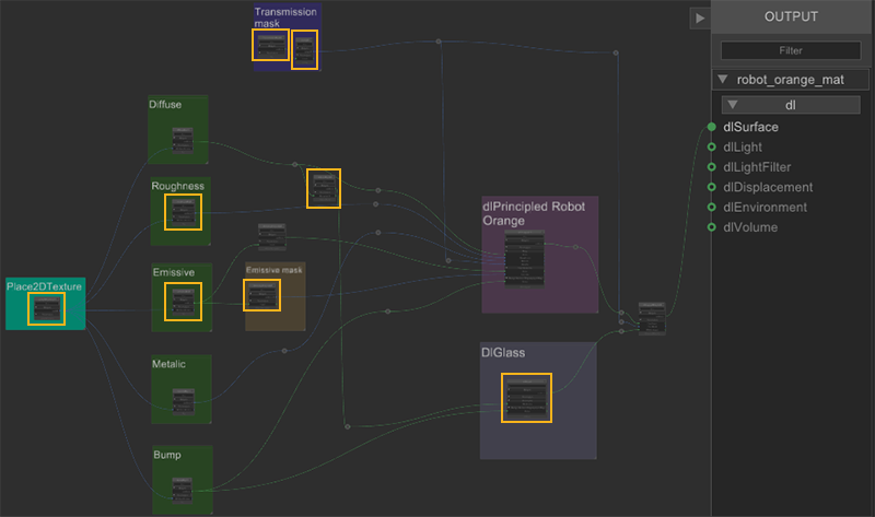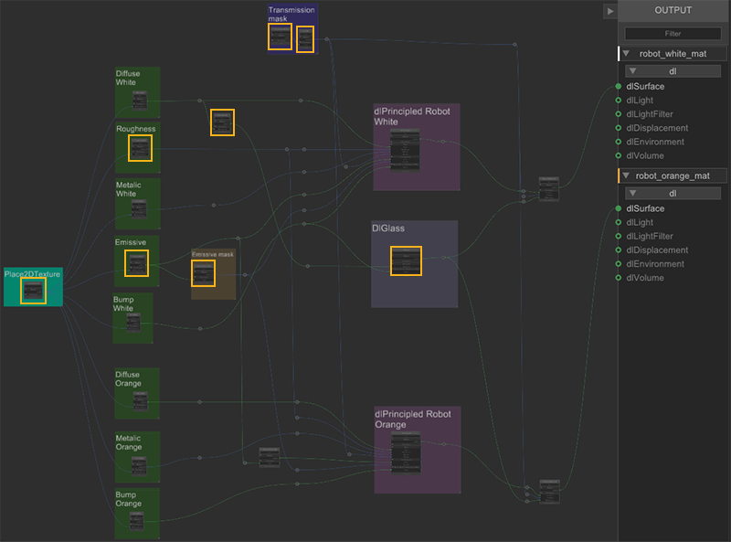 In this example there are two robot characters each requiring a different material variation. The ability to create multiple NetworkMaterials from one NetworkMaterialCreate node is very useful in this situation as each material variation uses some of the same textures and masks.