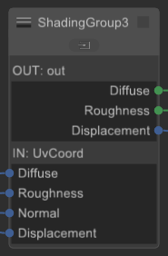 You can rearrange the order of your ports within a ShadingGroup, allowing you to customize its inputs and outputs. Rearranging ports allows you to organize your ShadingGroups easily. Changes made to the order of Input and Output ports made within the ShadingGroup are reflected on the ShadingGroup node when viewed within a Network Material context, such as NetworkMaterialCreate or NetworkMaterialEdit.