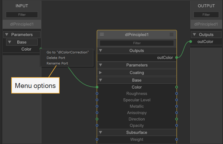 From inside the ShadingGroup, right-click on one of your ports to bring up the options menu. From here, you can: