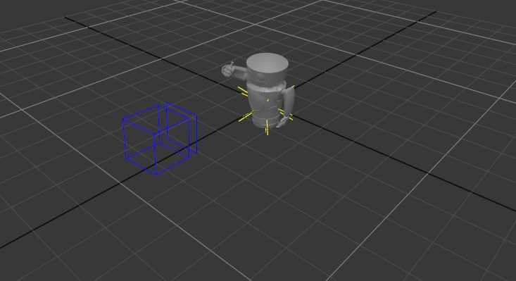 The unit of measure used is up to you, because Katana equates any value as being equal to one unit in 3D space. The image shows a simple scene containing an object and a camera. If the large white square in the Viewer represents one unit of measure, so the smaller squares represent one tenth of that unit. So, if you measured on set in meters, one small square could be equal to a meter, centimeter, or millimeter.