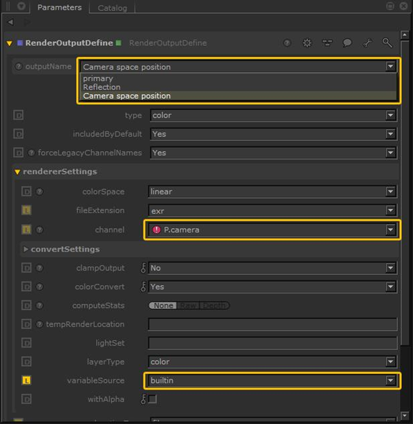 7. Set the outputName parameter to Camera space position. The channel value changes automatically to match the selection.