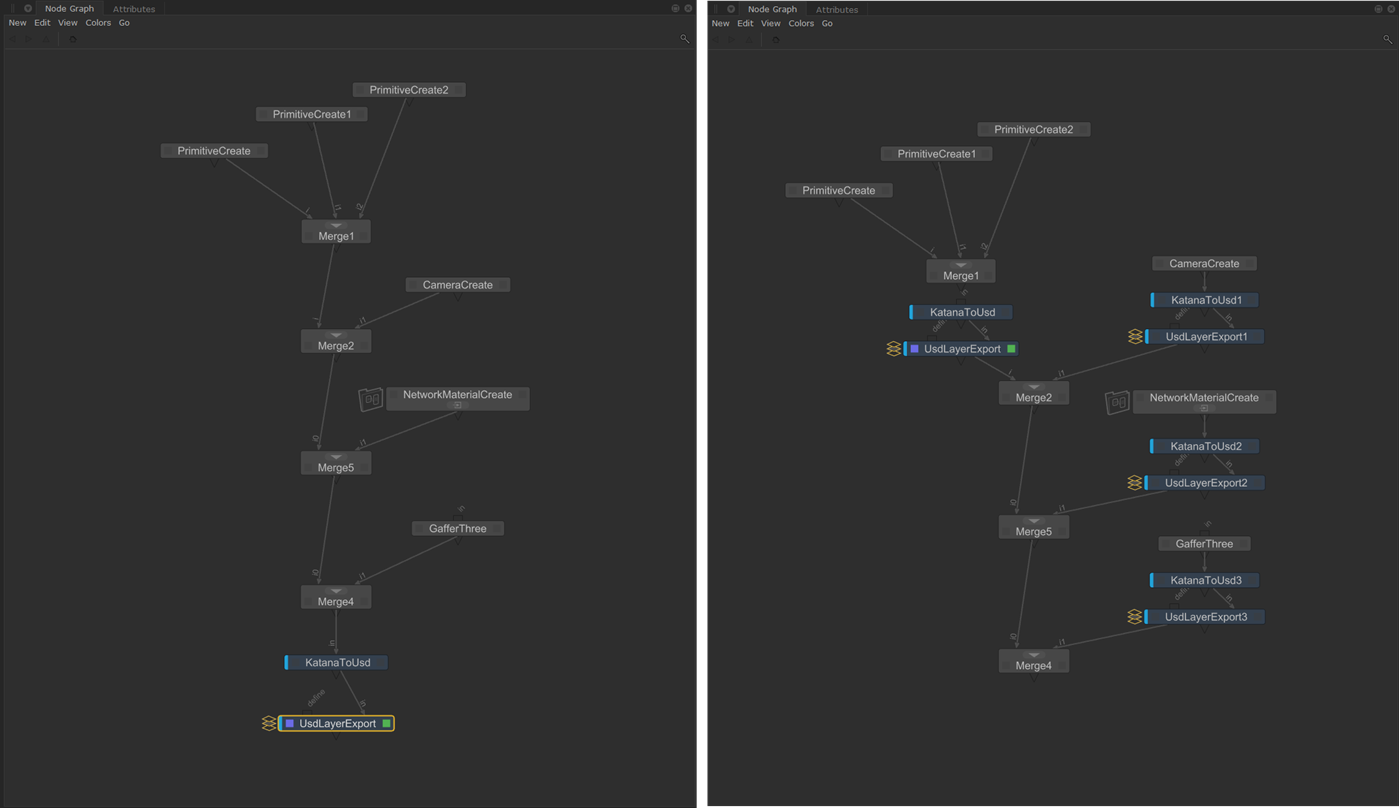 The KatanaToUsd node and the UsdToKatana node are conversion nodes used to get data from Katana’s Geolib space to USD’s native space and vice versa.