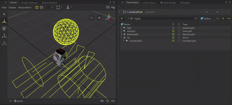 To add further lights within the Xform prim, select the ‘rig’ prim and use the + button again to add a light. The new light will be underneath the Xform in the hierarchy, both in the UsdGaffer treeview and in the Scene Explorer.