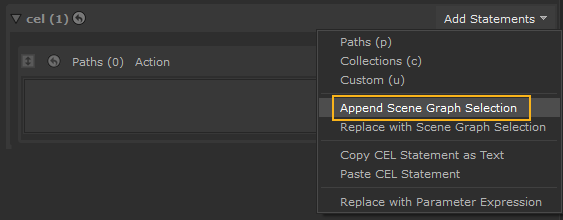 This scene graph selection can be used in CEL widgets through Add Statements > Append Scene Graph Selection / Replace with Scene Graph Selection.