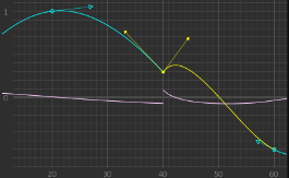 The purple velocity curve is broken (not continuous) at frame 40, as is the highlighted tangent.