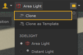 The Clone option uses a selected light as a basis for the new light you create. The new light has all the same parameters as the selected light including its size, distance, intensity, exposure and color, and any other parameters you may have changed.