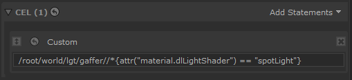 If you want this statement to affect all new and existing lights of a specific type in your scene, you can use an expression to access the attribute defining the light type. For this select Add Statements > Custom.