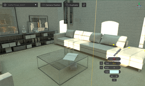 Lighting Tools makes it easy to switch between different GafferThree nodes, they are all displayed in a dropdown list in the Hydra Viewer when Lighting Tools is enabled.
