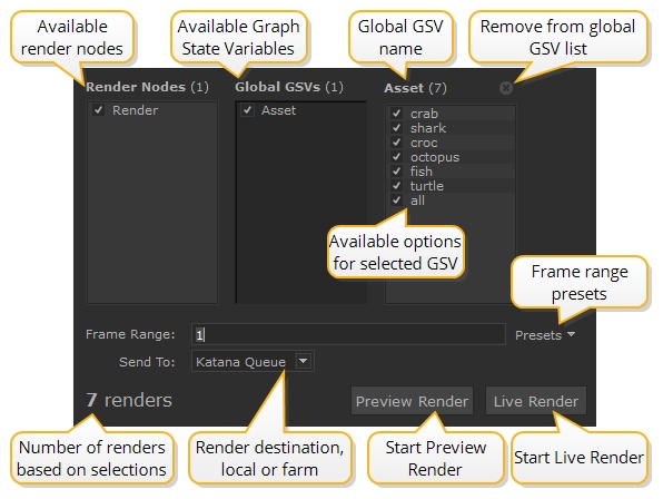 The Start Multiple Renders dialog allows users to start multiple Preview or Live Renders by selecting various combinations of global Graph State Variables (GSV). The ability to start multiple renders at once and have them render simultaneously can greatly improve efficiency as you don't have to wait for one render to finish before starting another. This can be very useful to compare lighting adjustments across multiple shots, or material and asset variations, for example.