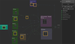 In this example there are two robot characters each requiring a different material variation. The ability to create multiple NetworkMaterials from one NetworkMaterialCreate node is very useful in this situation as each material variation uses some of the same textures and masks.