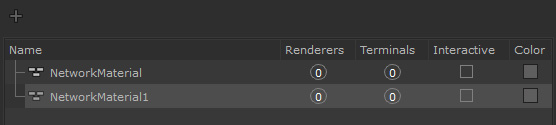 The Material Scenegraph also provides some information about each NetworkMaterial. You can see how many renderers and terminals are connected to each NetworkMaterial, set the interactive state of a NetworkMaterial, and assign it a color.