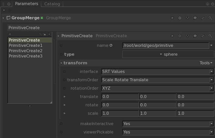 In the node graph, select any nodes you want to place in a GroupMerge node, then Shift+middle-click and drag them onto the GroupMerge node’s Parameters tab. The nodes are transferred to the GroupMerge node, and are editable in the GroupMerge node’s Parameters tab. GroupMerge nodes have additional Parameters tab options for adding, and editing nodes of their selected type. Above the list pane in a GroupMerge node’s Parameters tab are icons to add additional nodes of the selected type, filter the list of nodes, and lock highlighted nodes. Highlighting an entry in the list pane and pressing the D key disables the selected entry.