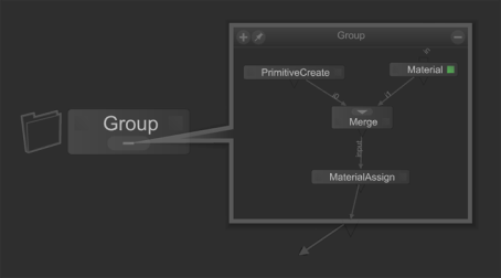 The contents of a group that holds PrimitiveCreate, Material, Merge, and MaterialAssign nodes, with a connection leaving the group from the MaterialAssign node. |