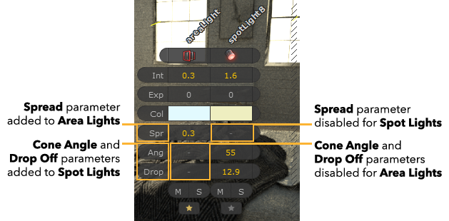 If you have two lights selected and have added extra parameters, the parameters for all the lights are visible but you can only edit the parameters for the light types that they exist in. If a parameter does not exist in a certain light type, it is disabled for that light type and marked with a dash.