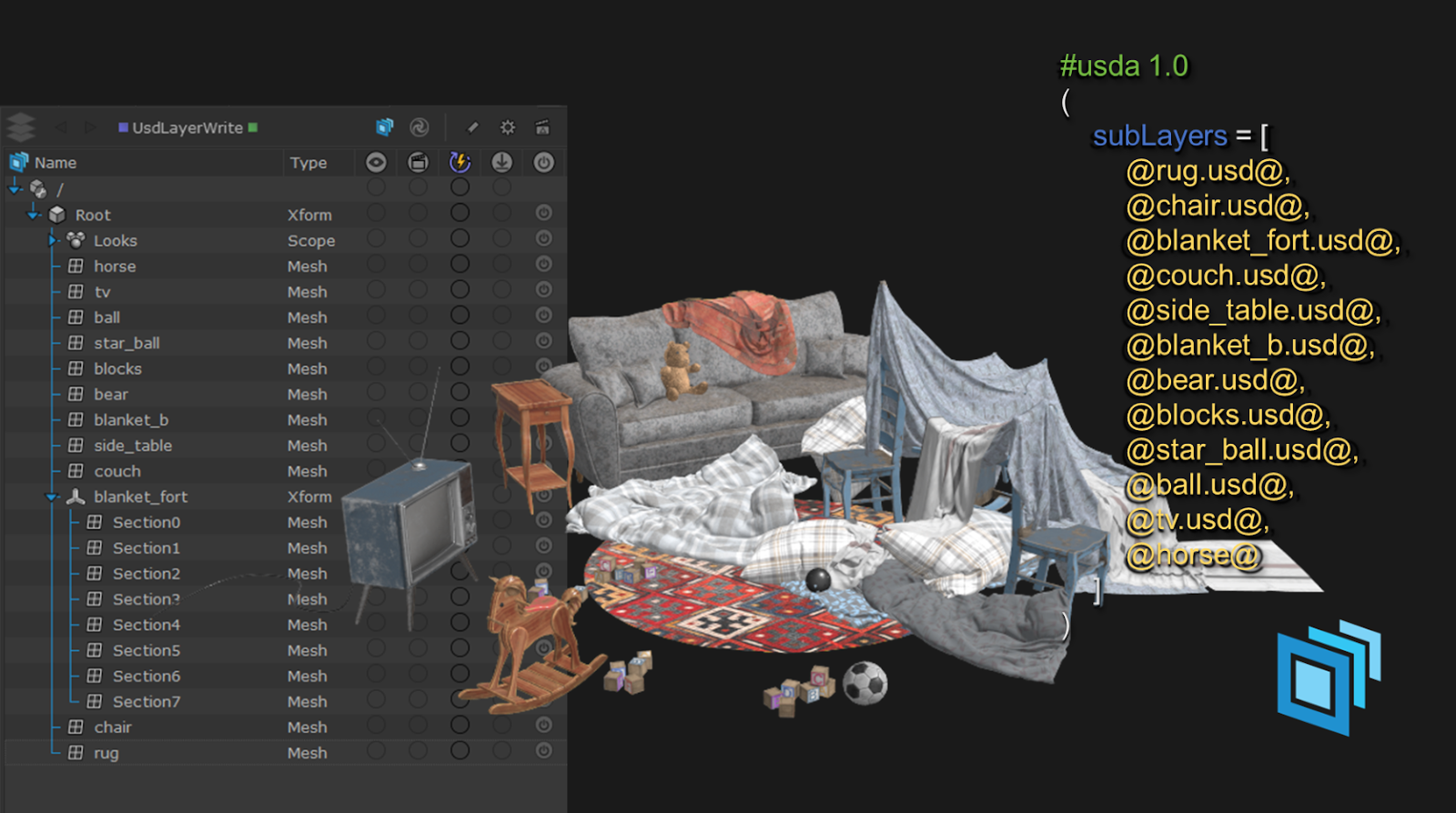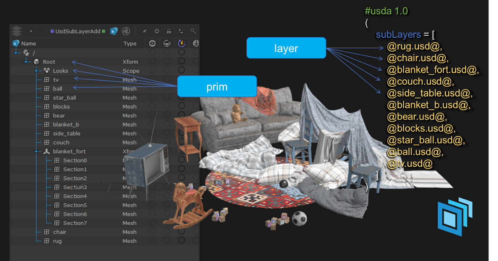 In order to put together a scene, you will need various types of layers. Different layers have different functions, and certain layers naturally override others. Understanding and composing this hierarchy is key to building a USD scene. To learn about this, see Composition Arcs - Understanding LIVRPS.