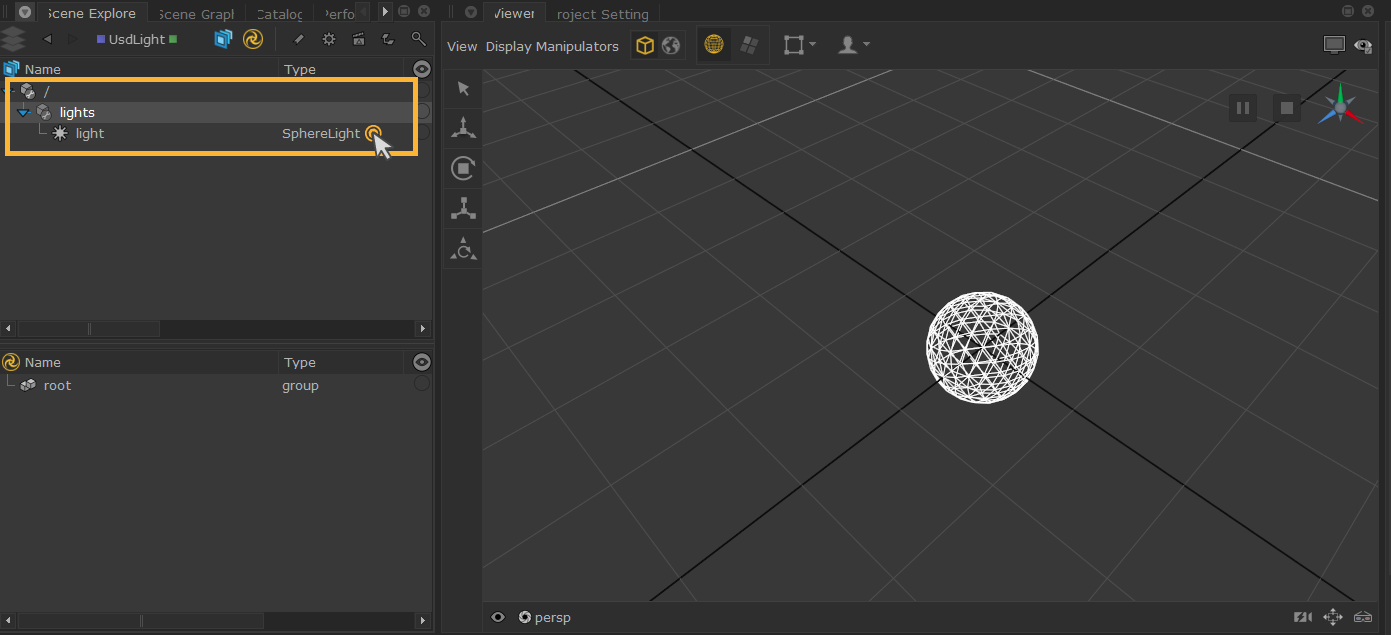 In this example, the Scene Explorer is expanded to the “light” prim path which will reveal it in the Viewer. Since it is a SphereLight (as described in the Type column), the relevant locators will display.