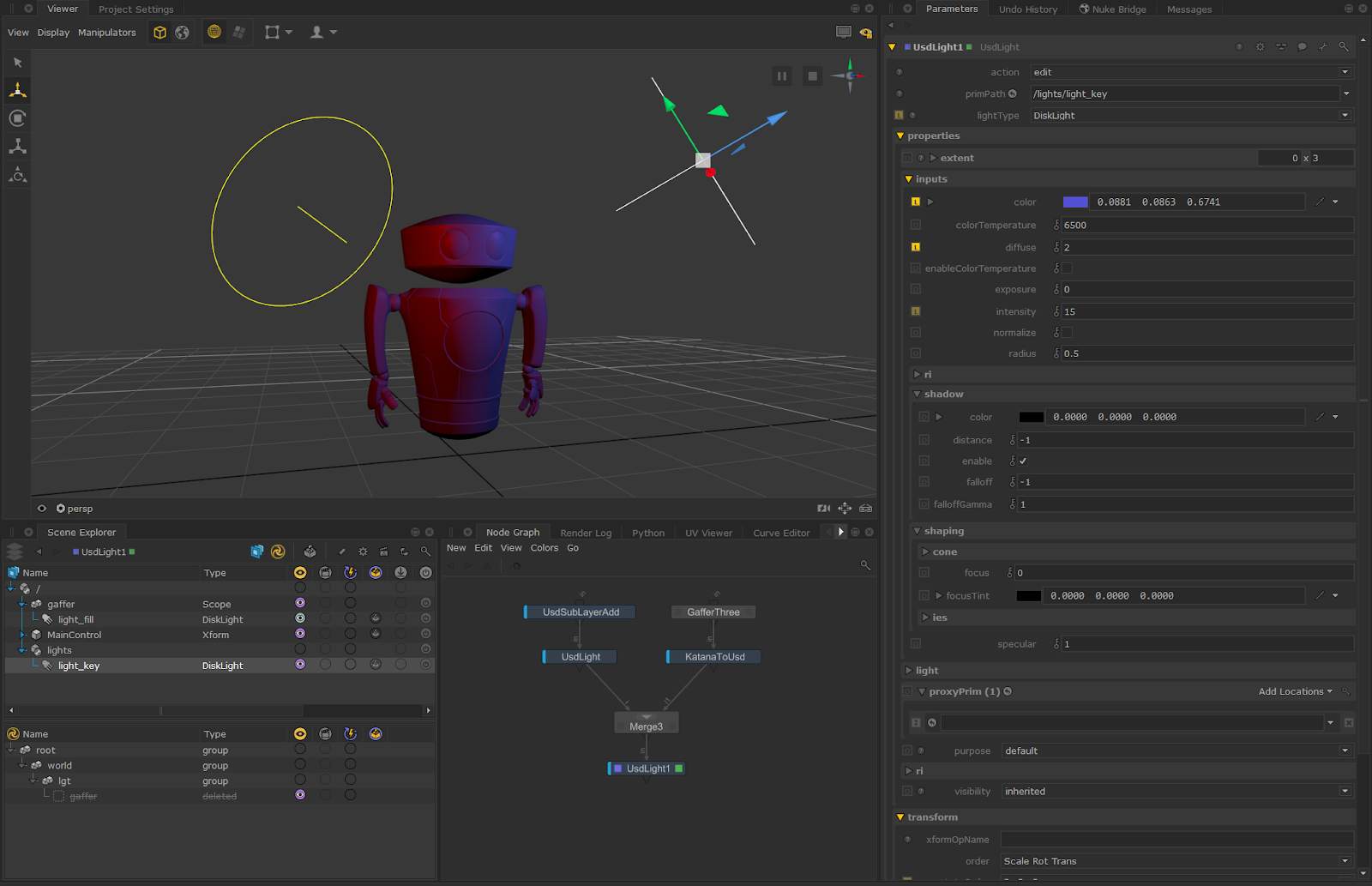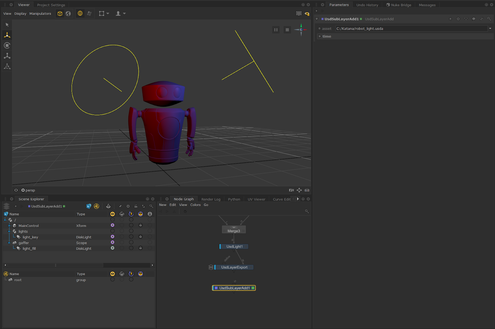 Creating USD lights in Katana can be done natively using the UsdLight node or by converting Katana lights to USD lights using the KatanaToUsd node. The example below showcases a simple lighting setup using a combination of the above.