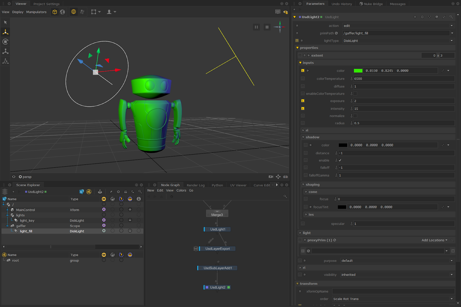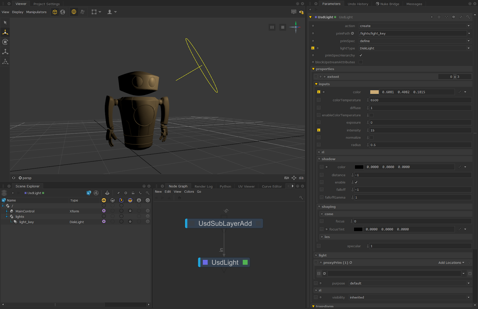 Tip: Each UsdLight node allows you to create one light at a time. While this node might be useful for smaller lighting setups, in most cases using the UsdGaffer node will be more flexible and faster as it allows the creation of multiple lights in one USD layer - see Using UsdGaffer.