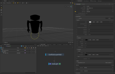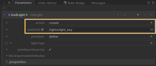 In edit mode, UsdLight will read the light primitive, dynamically set the lightType, and show incoming values in the Parameters tab. Any adjustments made will be set as an ‘over’ on the light primitive. We’ll use the previous example to show this.