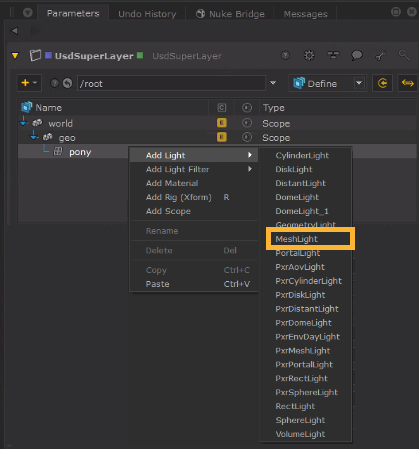 | 2. | Select the mesh prim that you want to add a light to in the treeview. In this example we have selected the 'pony' mesh, which was previously converted to USD and added as an incoming prim. Right click the mesh and go to Add Light > MeshLight (or select your renderer's MeshLight option). |