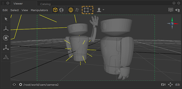 Snapping in the Hydra Viewer allows you to snap an object's Translate or Center of Interest manipulator to a target location's individual Vertices, Edges, Faces, Center or Object, as well as to Lights, Cameras, Locators, and Rigs. Snapping can be turned on and off using the Snapping tool button, or by pressing the V key. Snapping can also be turned on temporarily by holding the V key.