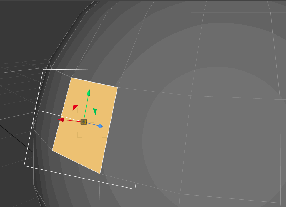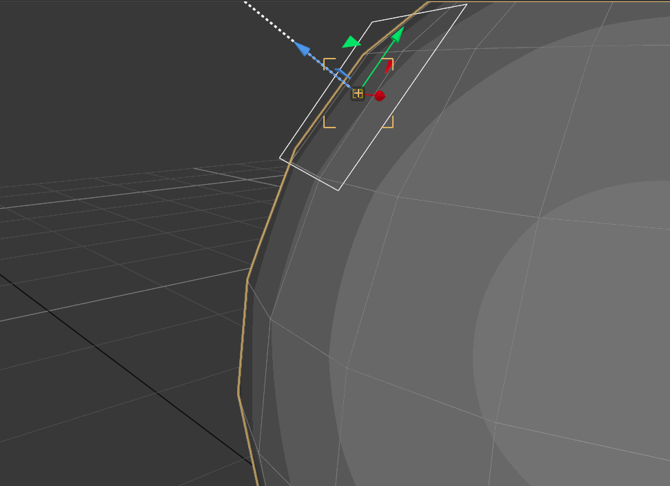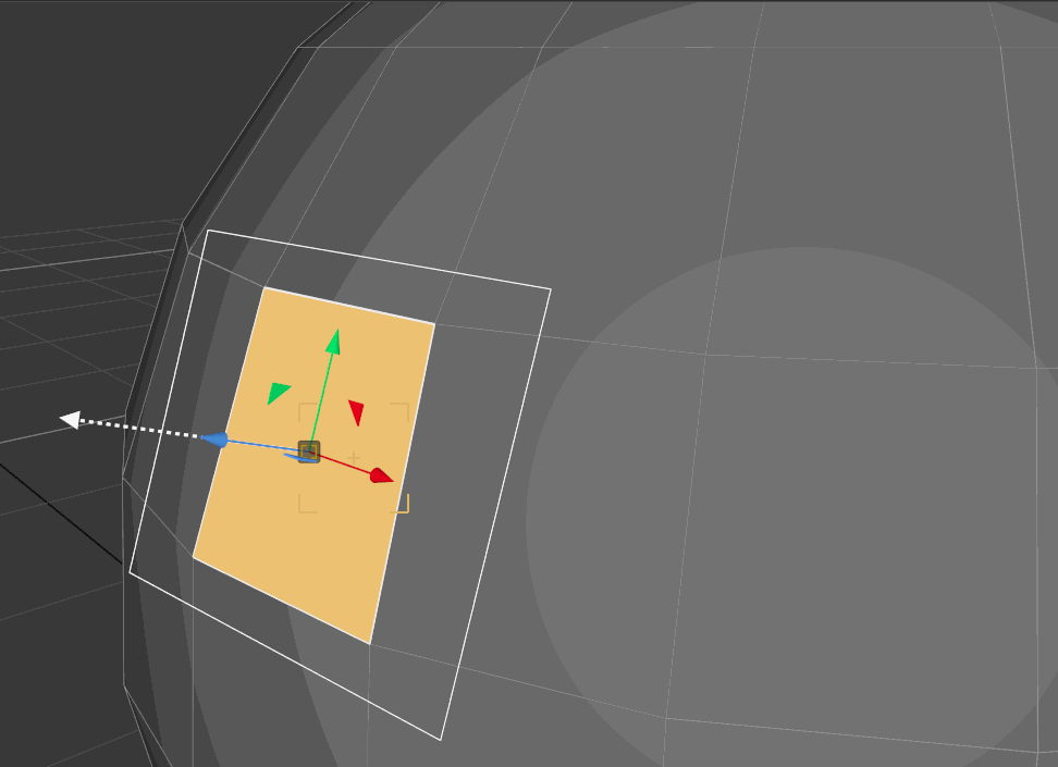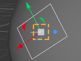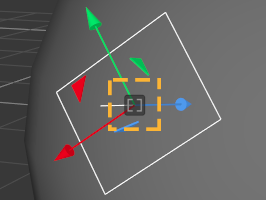 Snap to the closest point on an object's surface and orient the transformed mesh's rotation to point along the normal of the closest face. The normal is indicated by a white arrow with a dashed line. The target mesh is drawn with an outline, in addition to the target mesh's snapping wireframe being drawn. Note: In Oriented to Normal modes, the OrientAxis and UpAxis can be specified at: