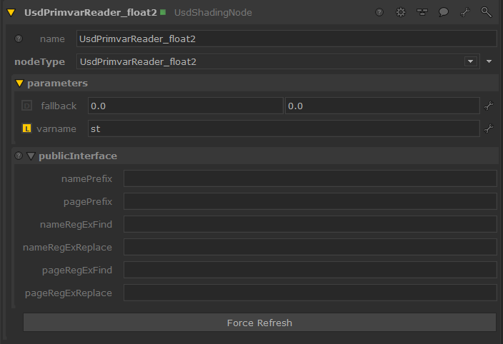 - Within the UsdPrimvarReader_float2, set the varname parameter to st.