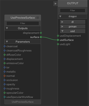 - Connect the surface output from the UsdPreviewSurface node to the usdSurface input under the usd drop-down in the Terminal sidebar.