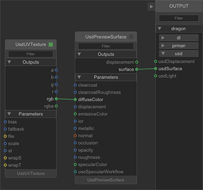 - Connect the rgb output from the UsdUVTexture node to the diffuseColor input of the UsdPreviewSurface node.