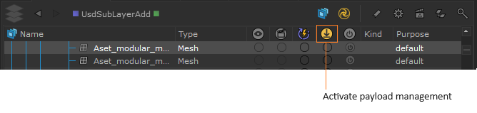 When this payload button is deactivated, payloads are loaded via expansion of USD scene graph locations, mimicking Katana’s deferred loading workflow. When expanding prim locations using the deferred loading method, payloads will load if they are present on that prim, but will not load any payloads on its decendants.