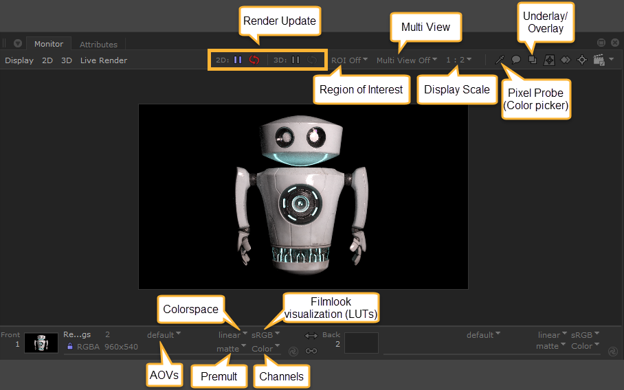 • Render Update controls - Choose a 2D or 3D update mode to determine when to trigger a render. See more at Changing How to Trigger a Render.