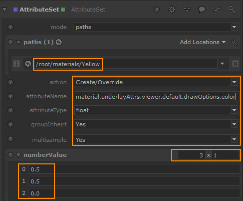 10.   Add an AttributeSet node and connect it to the bottom of the graph. Middle-mouse+drag the Yellow material from the Scene Graph on to the CEL path field and set the following parameters: