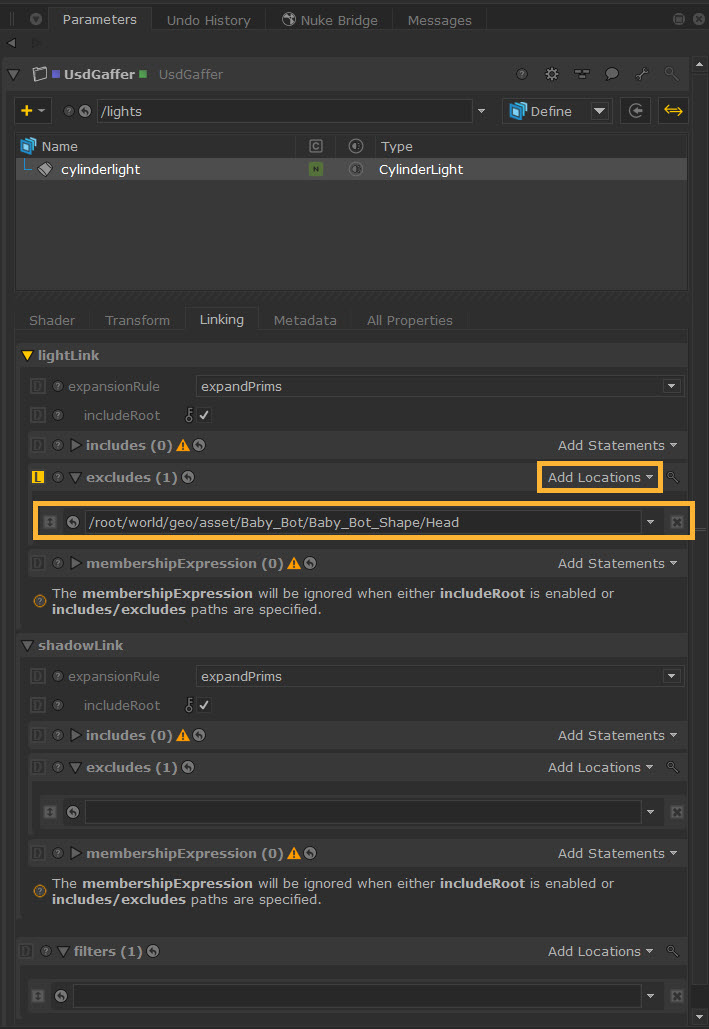 Warning:  Any collections that have been created via UsdGaffer or UsdSuperLayer can also be modified with UsdCollection node but there may be inconsistencies between them. For example, when creating a lightLink or shadowLink collection using the UsdCollection node, it will show includeRoot as false by default. However, it should be true for lightLink, shadowLink and filters collections, as explained above. To workaround this issue, you will need to override the includeRoot parameter manually.