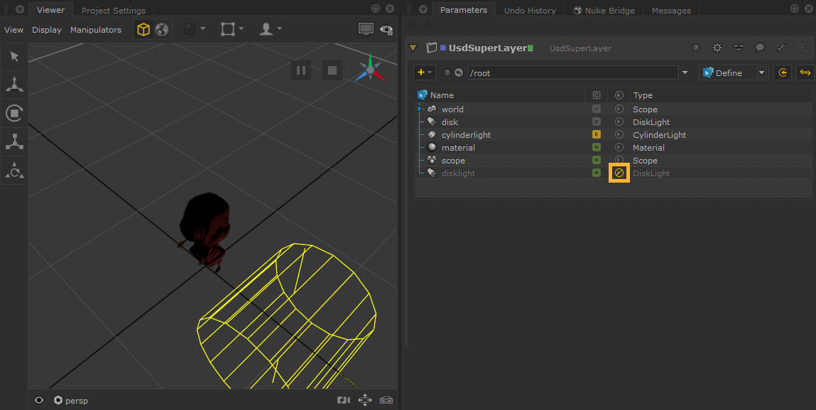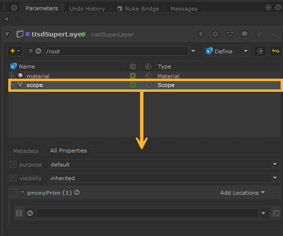 5.   When you select each prim in the UsdSuperLayer treeview, you’ll be able to view and edit its parameters in the panel beneath.