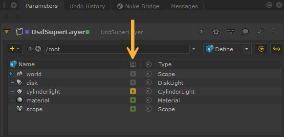 For example, here all Prims are set to Define. The ‘disk’ has already been set as a ‘class’ so it and its descendants are not affected.