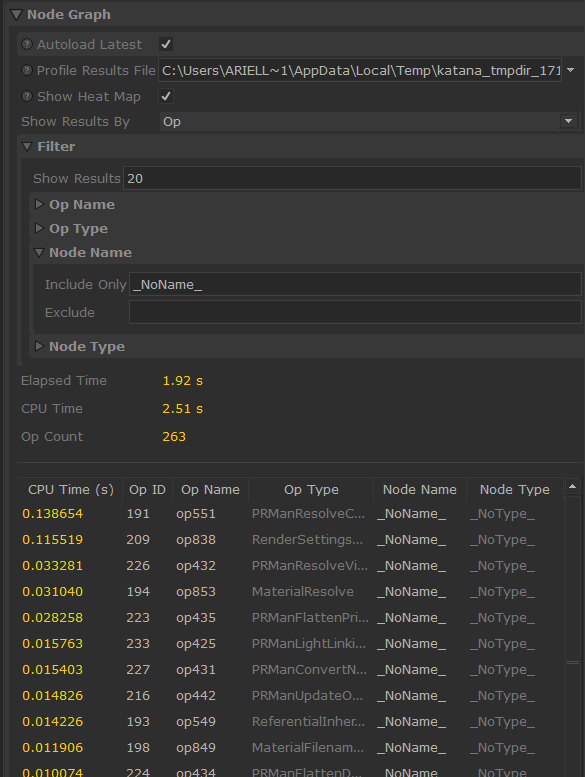 In the example below, we have set a filter for the _NoName_ entry, in order to delve into operations unrelated to nodes, such as implicit resolvers. See Implicit Resolvers for more information. For those wanting a breakdown of these _NoName_ operations, it is possible to set the Show Results By field to Ops, in order to view a breakdown of these implicit resolvers.