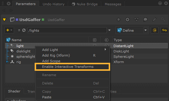 You can also right click on the light prim in UsdGaffer treeview and select Enable Interactive Transforms or Disable Interactive Transforms. This has the same effect as the makeInteractive parameter by turning the ability to make transformations in the Viewer on or off.