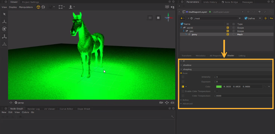 | 4. | The mesh light parameters can then be found in the Shader tab underneath the UsdSuperLayer treeview. You can use this section to adjust parameters such as Color and Intensity. |