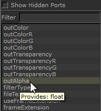 표준 노드에서 허용 할 수없는 입력 포트 outAlpha 입력 (예 : Decay Rate)이 회색으로 표시됩니다.