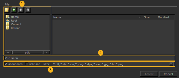 • 파일 목록을 사용하여 파일 목록을 특정 파일 형식으로 제한 Filter 드롭 다운 메뉴 및 sequences 확인란.