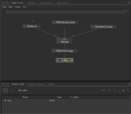 두 번째 개념은 다음과 같습니다. there is no such thing as the scenein Katana. 레시피를 병합하고 분기하고 가지 중 하나에 가지 치기 및 추가 할 수 있습니다. 따라서 V 다른 노드에서 매우 다른 장면을 생성 할 수 있습니다. 이를 직접 보려면 CameraCreate 노드 위에 마우스를 놓고 V. 레시피의이 노드에서 카메라 만 생성되었으므로 장면 그래프가 변경됩니다. 다른 노드에서 생성 된 3D 장면을 같은 방식으로 볼 수 있습니다. 마음에 들면 GafferThree 노드 위로 마우스를 가져간 다음 V 다시.