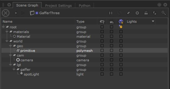 조명은 일반적으로 GafferThree 노드 내에 생성됩니다. 이름은 조명 설정을 담당하는 사람의 역할 인 Gaffer에서 비롯됩니다. GafferThree 노드는 조명 생성, 쉐이더 할당, 조명 솔로 및 뮤팅과 같은 여러 편리한 조명 기능을위한 원 스톱 상점을 제공합니다.